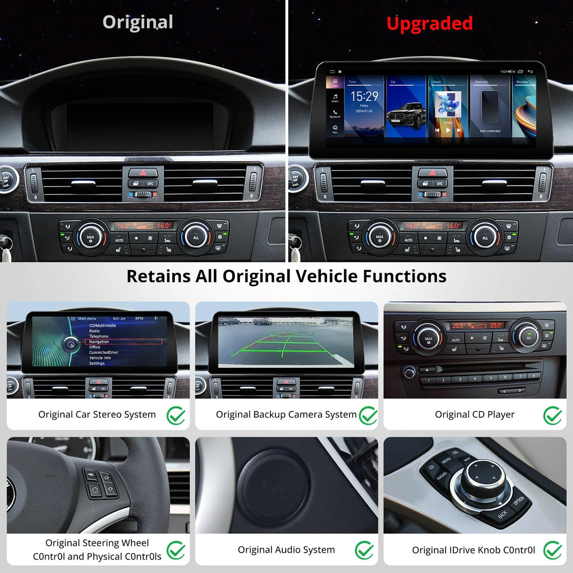 - Engineered for compatibility with original system: Design for BMW 3 Series E90 E91 E92 E93 2008-2012 with CIC original 4 PIN LVDS system. It retains all original vehicle functions and offers a large screen without blocking vents or c0ntr0ls