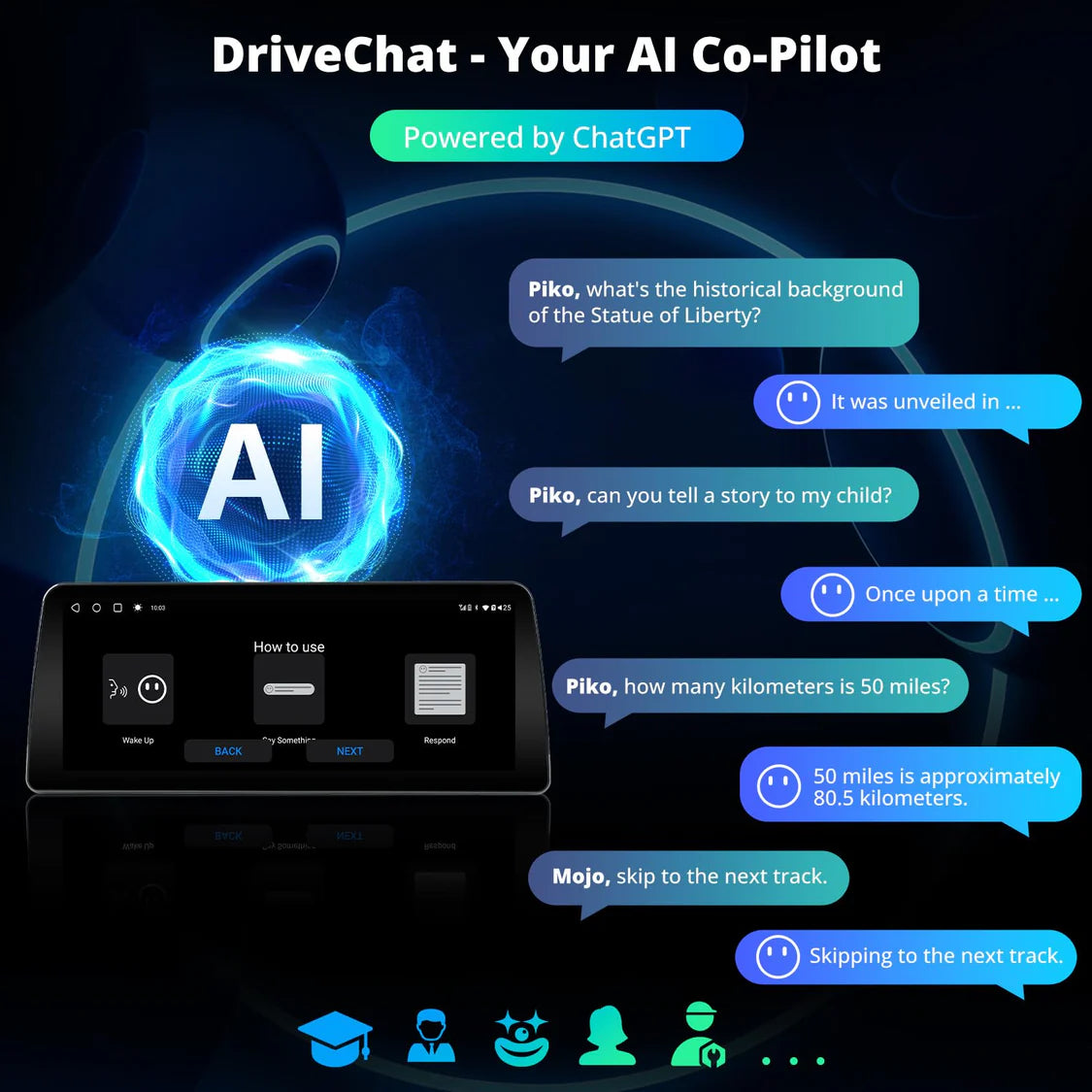 - DriveChat - Your AI Co-Pilot: Imagine an AI co-pilot who listens and assists with tasks while you drive; Curious about a scenic spot or unsure how to use a feature? Just ask DriveChat and keep your hands on the wheel and your focus on the road